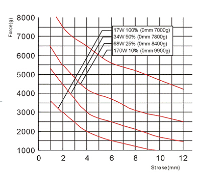 力量曲線圖圖解:T6490力量曲線圖中分別是10%、25%、50%、100%通電時(shí)行程和力量的曲線圖,其中橫向軸代表的是行程(mm),縱向軸代表的是力量(g)。